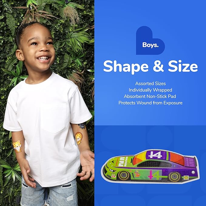 - ASSORTED BANDAGES: This 100 piece pack of adorable assorted boys bandages is great for putting a smile on kids' faces while protecting wounds such as cuts, scrapes, and burns, and come in 10 assorted styles (baseball, race car, firetruck, football, guitar, monkey, dino, lion, bacon, and hot dog); sticky bandages are perfect for kids and adults alike, and also for school nurses and pediatric doctors