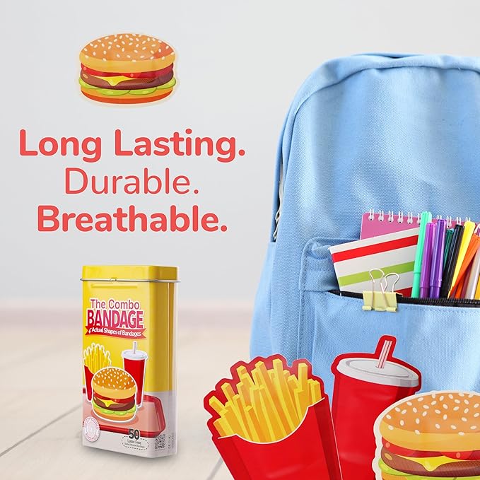 - COMBO MEAL BANDAGES: This 50 piece pack of adorable fast food shaped bandages is great for putting a smile on kids' faces while protecting wounds such as cuts, scrapes, and burns and comes in an assortment of french fries, burgers, and soda shapes; sticky bandages are perfect for kids and adults alike, and also for school nurses and pediatric doctors