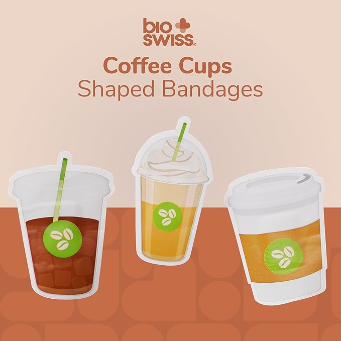 BioSwiss Bandages, Coffee Cup Shaped Self Adhesive Bandage, Latex Free Sterile Wound Care, Fun First Aid Kit Supplies for Kids, 24 Count