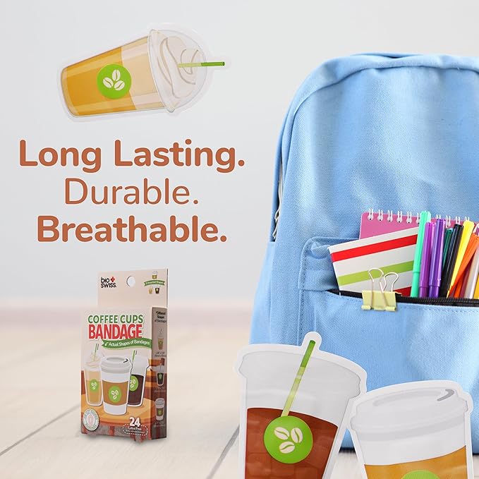 - COFFEE BANDAGES: This 24 piece pack of adorable coffee cup shaped bandages is great for putting a smile on kids' faces while protecting wounds such as cuts, scrapes, and burns; sticky bandages are perfect for kids and adults alike, and also for school nurses and pediatric doctors