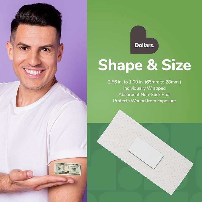 - MONEY BANDAGES: This 24 piece pack of adorable dollar bill shaped bandages is great for putting a smile on kids' faces while protecting wounds such as cuts, scrapes, and burns; sticky bandages are perfect for kids and adults alike, and also for school nurses and pediatric doctors