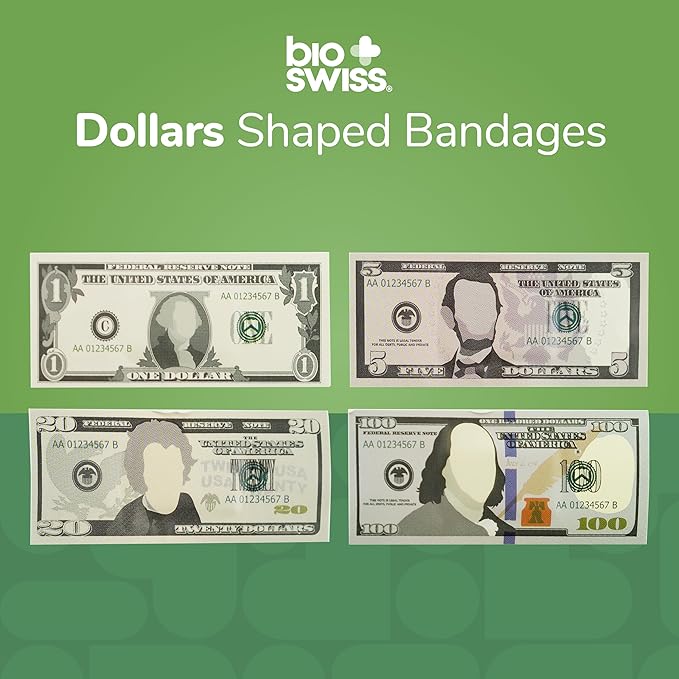 BioSwiss Bandages, Money Shaped Self Adhesive Bandage, Latex Free Sterile Wound Care, Fun First Aid Kit Supplies for Kids, 24 Count