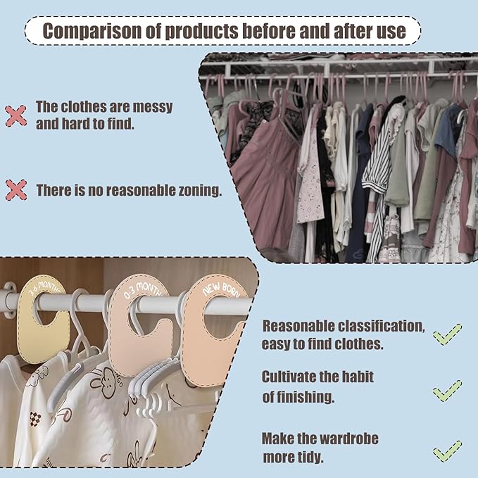- 【Compact and Lightweight Design】These baby clothes dividers for closet are designed to be just the right size for standard closet rods, ensuring the baby clothes dividers don't take up too much space or add unnecessary weight. The nursery organization’s compact and lightweight nature makes them easy to handle and reposition, so you can effortlessly keep your baby’s clothes neatly organized. The baby size closet dividers are sturdy enough to hold up to frequent use, ensuring that your baby’s closet remains clutter-free and efficient.