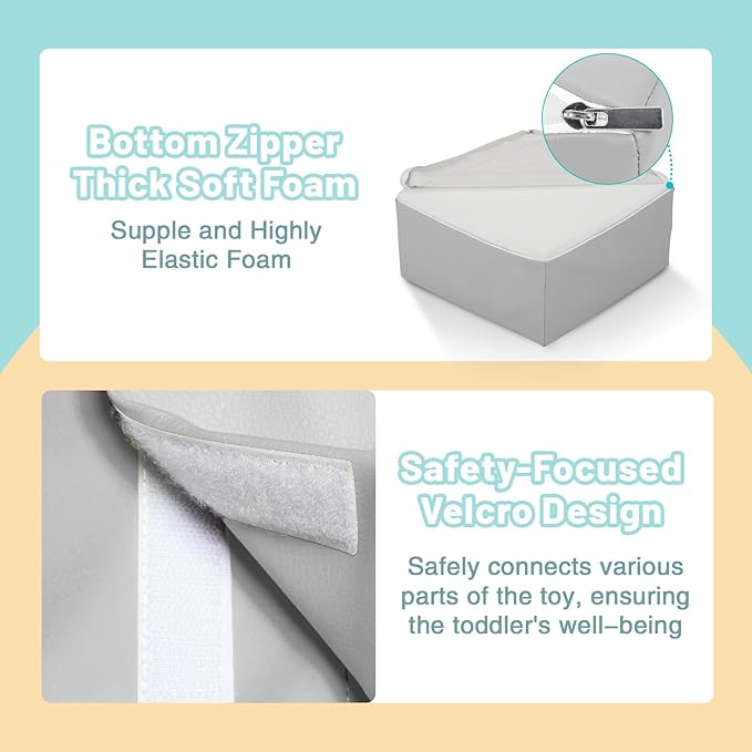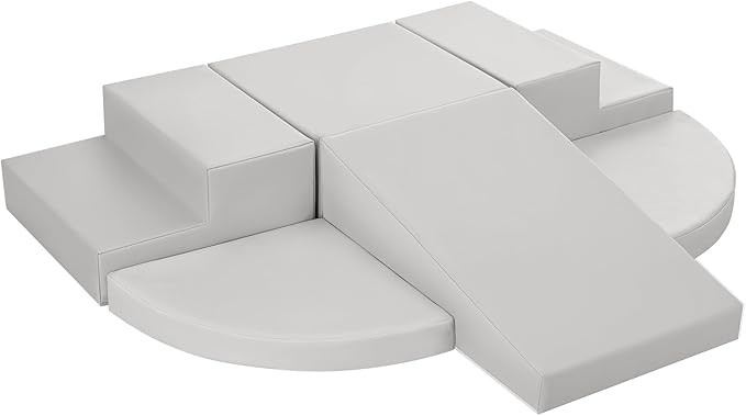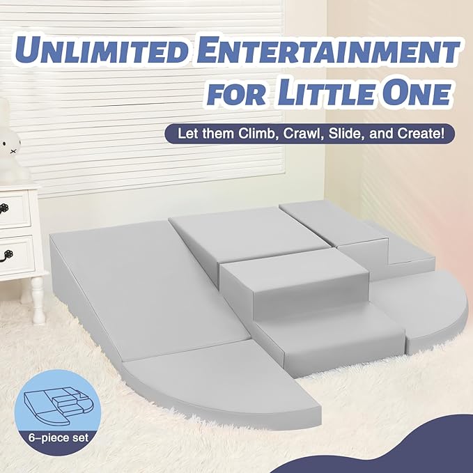 - 6-Piece Set: Baby climbing blocks consists of 2 grey stairs, 2 grey half-moons, 1 grey square and 1 grey slide. This soft play equipment stimulates your child's imagination to create endless combinations of structures, allowing them to enjoy the fun of the toy as they climb up and down, stacking and swapping four different shapes. Our climbing sets have a unique patented design that your child is sure to love
