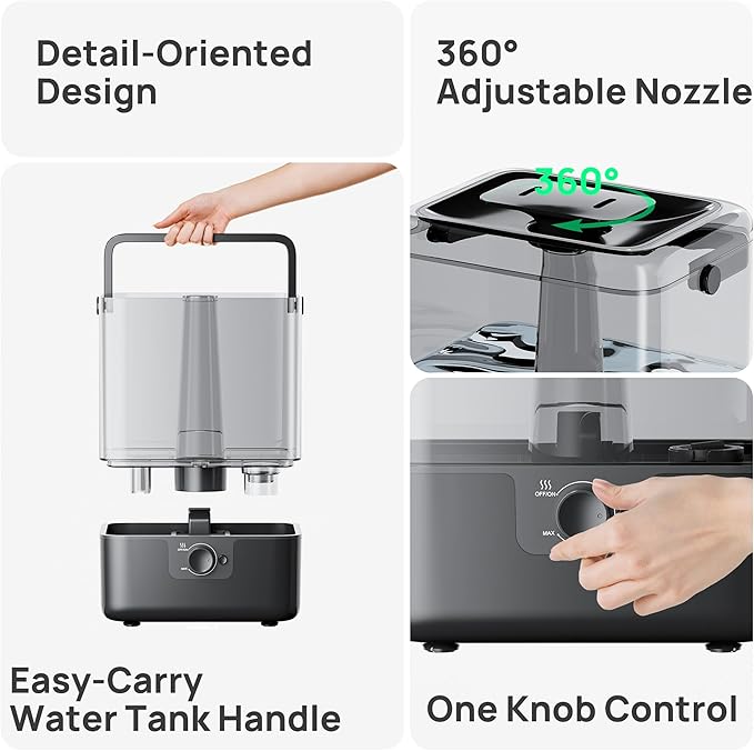 - 2-IN-1 Cool Mist Humidifier and Diffuser: Ultra fine cold mist up to 300ml/h can quickly add moisture to the air in large rooms, helping to alleviate cough, dry skin, sinus problems, and other issues caused by air dryness. The humidifiers for home is recommended to use distilled water and purified water for better health benefits. Put cotton pads with added essential oil in a dedicated oil tank. Note: Do not drip essential oil directly into the water tank