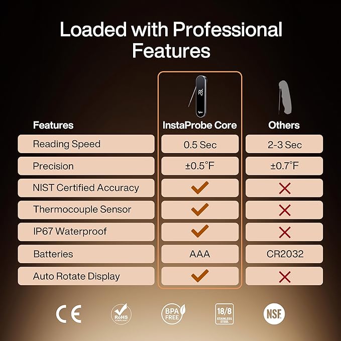 InstaProbe Core 0.5 Sec Instant Read Meat Thermometer Digital with Readable Display in Sunlight for Cooking, Professional Thermometer with IP67 Waterproof for Grill, BBQ, Cooking, Smoker