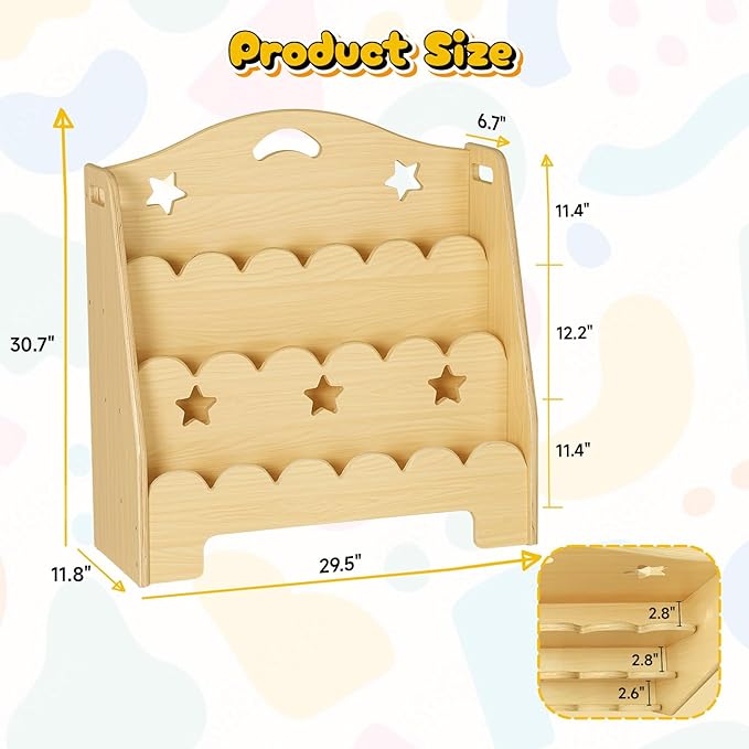 - DESIGNED FOR KIDS: At 29.5" x 11.8" x 30.7" (L x W x H), this small book shelf has a right height for children, allowing them to easily reach their favorite books. Books can be displayed by front cover instead of the spine, making it easier for kids to choose books, fostering good habits of reading and organizing. Also,the edges and corners of the wooden bookshelves are smoothly rounded off and a metal anti-tipping anchor ensure the safety of children when using it