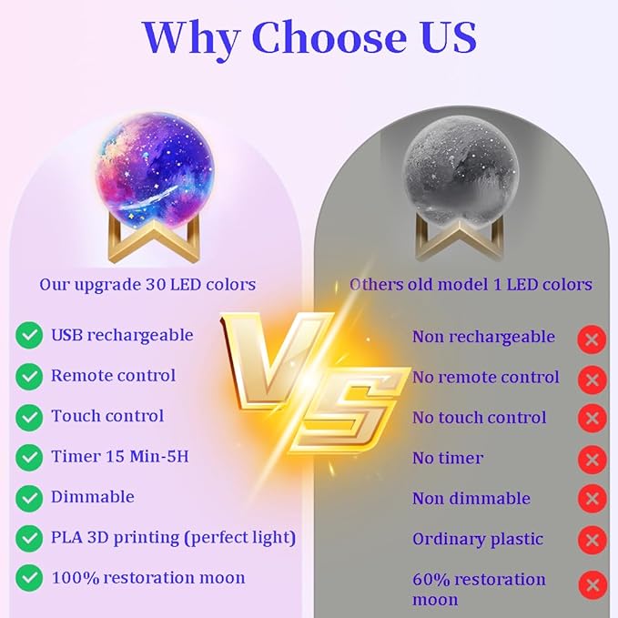 - 2025 Upgrade- We have added a charging function. When it is out of power, you can use a Type-C charging cable to charge it. And we have also added a remote control. You can use the remote control to switch 30 different light colors, and you can also use the remote control to set the timer function for 15 minutes -30 minutes -45 minutes -1 hour -2 hours -5 hours. Touch the metal ring of the moon lamp charging port to switch between 7 different light colors. It is so convenient.