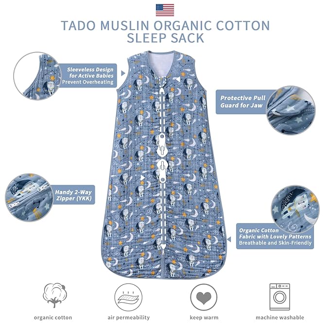 - TADO MUSLIN: At TADO MUSLIN, we are dedicated to delivering only the highest quality products. That's why our organic cotton sleeping sacks are GOTS-certified, meaning that no harmful substances have been used in the production process. Every bag is thoroughly inspected to ensure quality and safety.