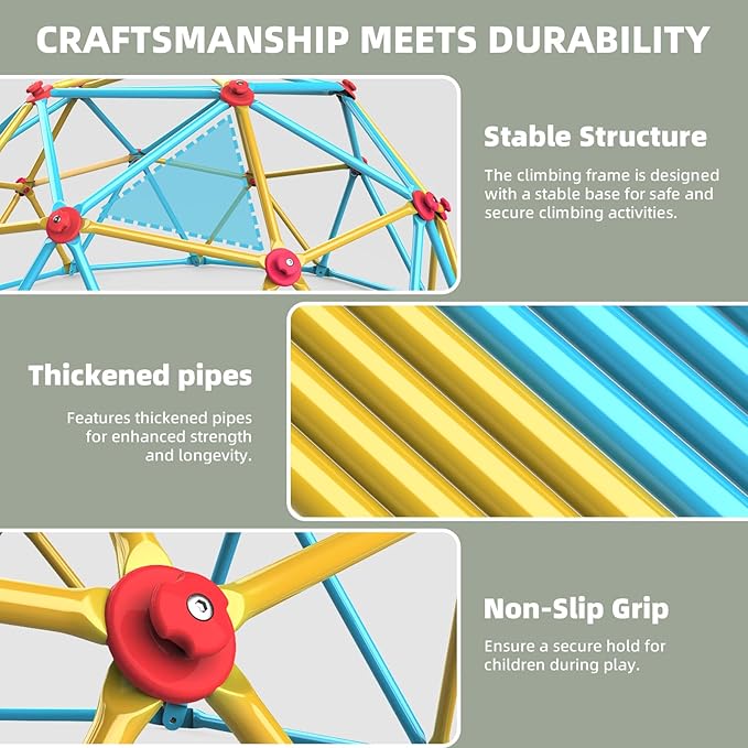- Robust Construction: The geometric dome is crafted from thickened galvanized steel poles. The 1 in diameter poles exceed the standard market, supporting a load of 800 lbs. Rust-proof coating safeguard against scratches for kids.