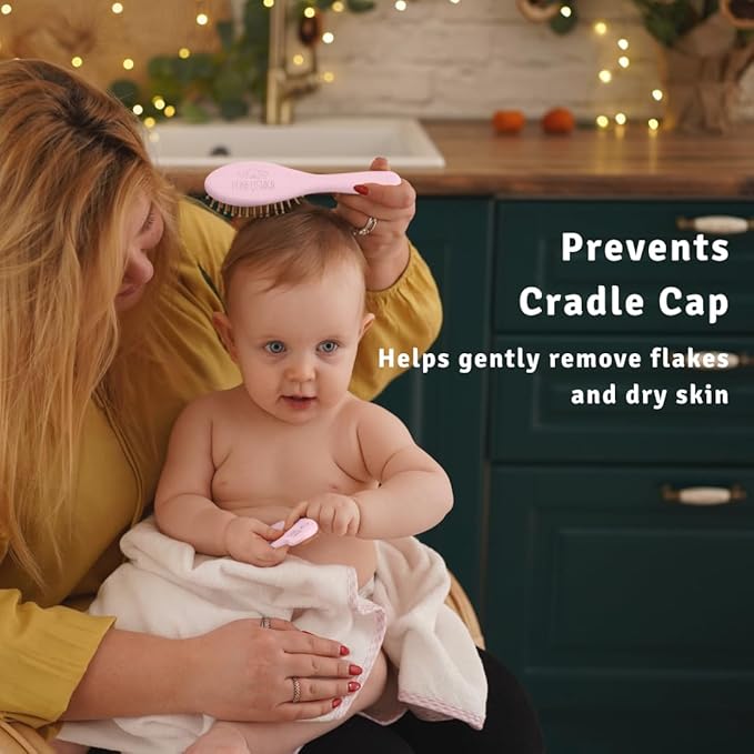 Baby Hair Brush Set for Newborns - Baby Brush and Comb Set - Ultra Soft Goat Hair Bristles, Perfect for Cradle Cap, Newborn Showers & Registries Gift, Comb Brush for Girls & Boys (Rosa)
