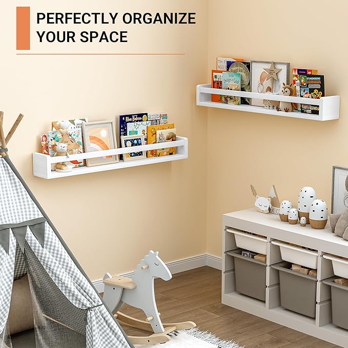 - [Versatile Nursery Shelves] - Heimlove floating shelves offer two installation options, allowing you to mount them either upwards or downwards, effortlessly adapt them to fit any space or aesthetic.They are perfect as a chic bookshelf for a nursery, a display shelf for the living room, or a spice rack for the kitchen.