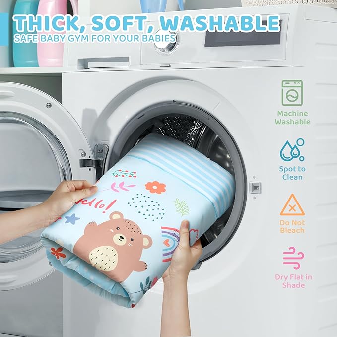 - Soft, Safe, and Washable - The baby play gym mat is made from high-quality fabrics, thick, delicate, and smooth touch, safe and comfortable for baby skins. Machine washable, easy to clean and keep hygienic. The tummy time activity mat can also be used directly on the floor, providing cushioning and protection for the baby. The balance of flatness and softness makes it more stable for babies to sit, stand and crawl.