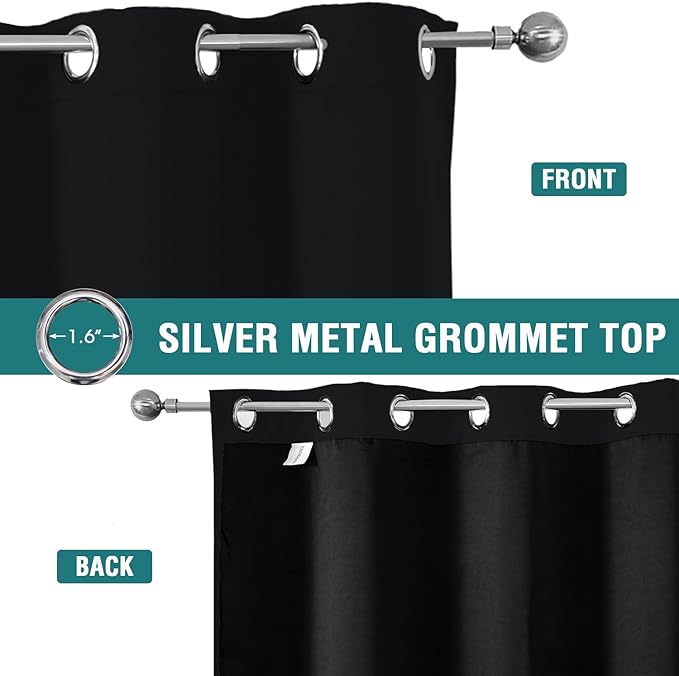 - SET DETAILS: Set of 2 total blackout curtain panels per package. Each lined curtain measures 52 inch wide by 102 inch long with 8 silver metal grommets (1.6 inch inner diameter) on top, easy to install and slide.