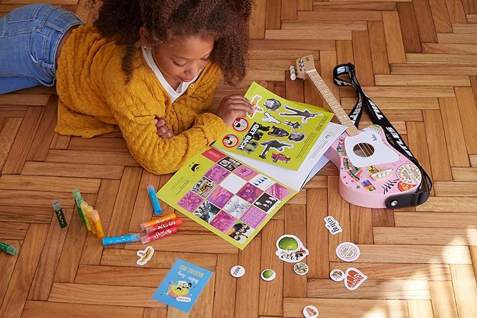 - Beatles + Loog Mini Acoustic Guitar comes bundled with an activity book full of Beatles' games and trivia, a Beatles strap, Beatles picks, pins and stickers, and access to an exclusive Beatles section in the Loog app, where children can learn to play Beatles songs.