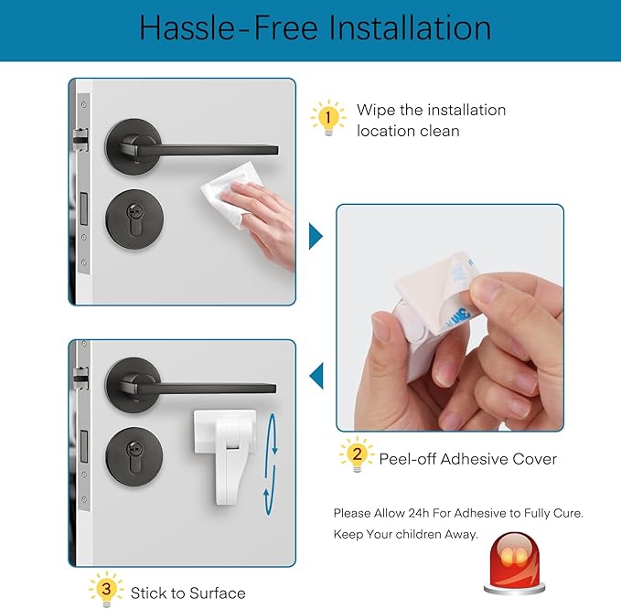 - Easy to Install and Remove: No need tools. Peel the damage-free 3M adhesive and place the Baby Safety Door Handle Lock on the door. Use hair dryer will help you remove the lock without any residue