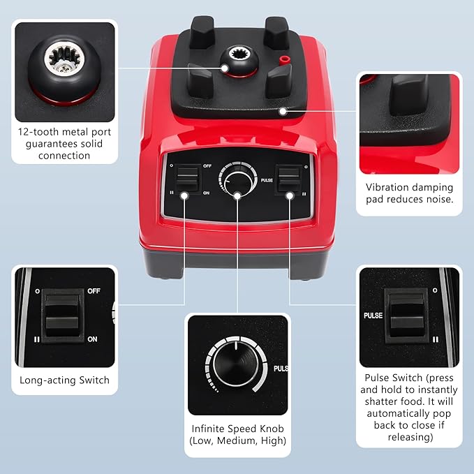 - 【Control Panel】The panel includes long-acting switch, pulse switch (press and hold to instantly shatter food, it will automatically pop back to close if releasing and is suitable for large pieces of food or ice), and speed control knob (low, medium and high)