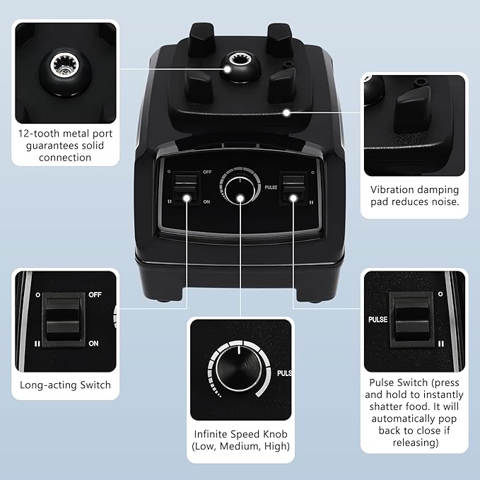 - 【Control Panel】The panel includes long-acting switch, pulse switch (press and hold to instantly shatter food, it will automatically pop back to close if releasing and is suitable for large pieces of food or ice), and speed control knob (low, medium and high)