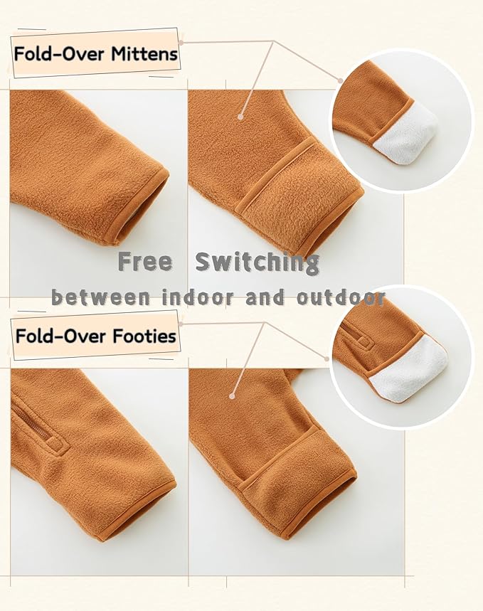 - [Thoughtful design] The double zipper design makes it easy to put on and take off jumpsuits, effortlessly solving the problem of changing diapers! Fold-over mittens and footies, as well as a hooded design, provide extra warmth for babies in cold weather. Indoor and outdoor free switching, can meet your various wearing needs, warm and fashionable.