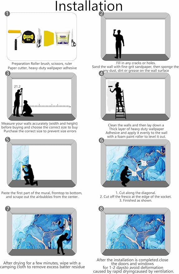 - Installation Steps1. Fill in any cracks or holes and clean the surface of the wall of dust, dirt and grease.2. Apply heavy-duty wallpaper paste to the wall, not the mural.3. Mark the position of each strip of wallpaper with a spirit level.4. Align the pattern and slide it into place.5. Scrape the bubbles with a spatula.6. Let it dry for a couple of minutes and it's ready to go!
