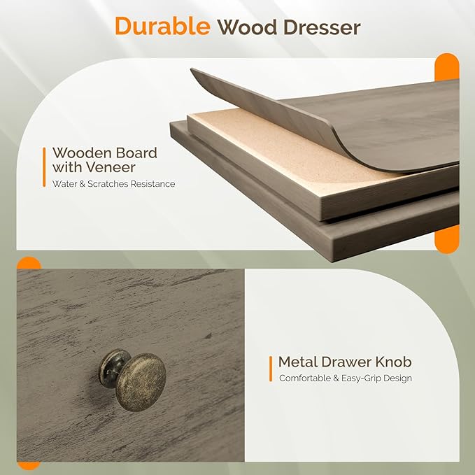 - 【Iron Full Extension Silent Drawer Slide】The wooden dresser and the water-proof finish is resistant to scratches and water, so the chest will remain sturdy and intact over time. Each drawer is equipped with durable metal full-extension glides, ensuring effortless opening and closing, making it a breeze to access your items.