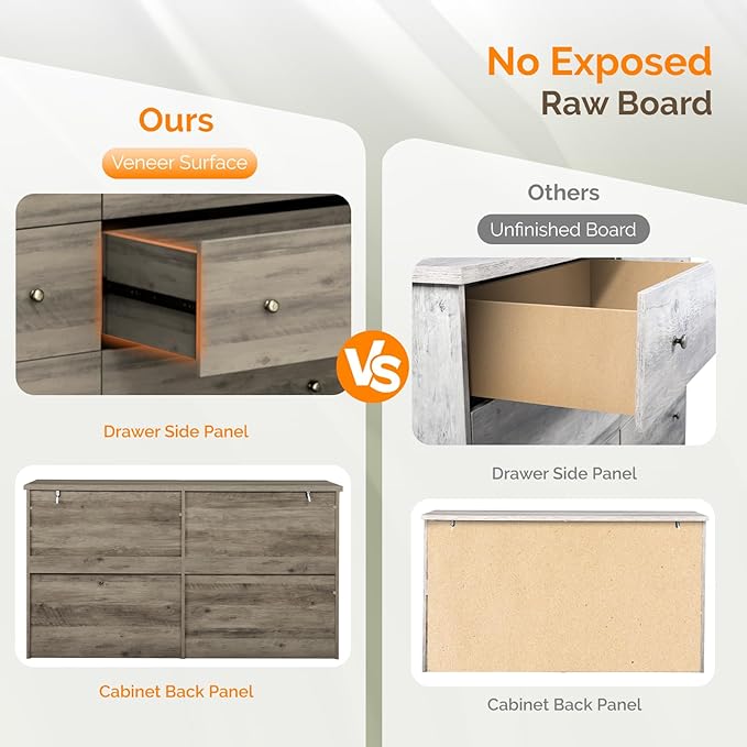 - 【Rustic Dresser】The wood grain surface in a washed grey finish exudes a sense of rustic authenticity. It serves as a neutral canvas, making it easy to coordinate with other bedroom decor and color schemes. The combination of metal brass knobs and weathered finish adds a chic and timeless look that can withstand changing trends.