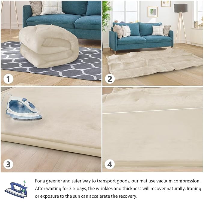 - šHOW TO CARE FOR YOUR MAT:When you open the package,it may be wrinkled,very flat and inelastic.Donāt fret - this is normal! As long as it is left for 3-5 days, the mat will naturally regain its thickness and elasticity. we recommend steaming or ironing it to speed up recovery. After you have completed the steaming/ironing, your thick floor padded mat should rebound and be ready to use!