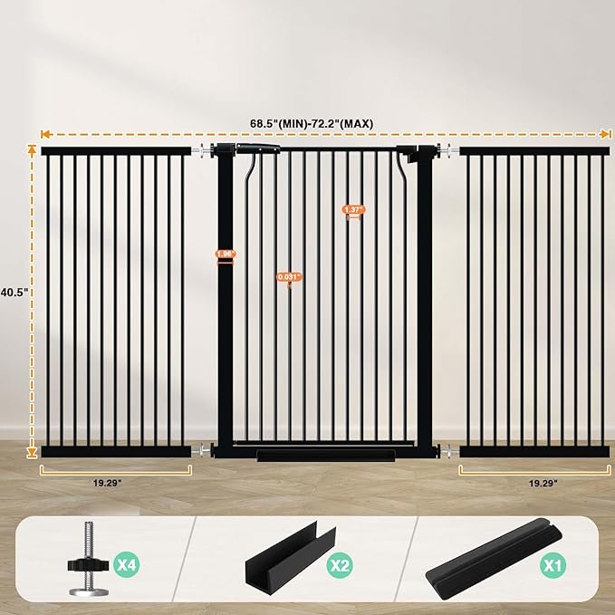 40.5" Extra Tall Baby Gate for Stairs, 68.5"-72.2" Extra Wide Long Dog Gate for The House, Safety Child Gate Easy Walk Thru Indoor, Metal Auto Close Pressure Mount Pet Gate for Doorways Hallway, Black