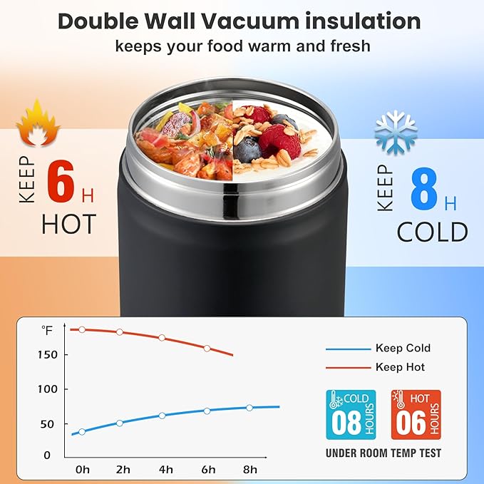 - 17 oz Vacuum Insulated Food Jar: The perfect sized thermo hot food jar for kids with superior insulation and 304 stainless steel to keep your food at the optimal temperature, use the insulated food containers for both hot and cold foods such as pasta, soups, and milkshakes.