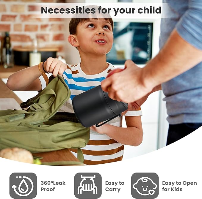- Leak-Proof Design: Featuring an upgraded double-layer silicone seal that provides a 360° leak-proof guarantee. Rest assured that our leak-proof thermo food jar can fit in your lunch bag without worrying about spills. The insulated thermal food jar comes with a stainless steel spoon for your child's convenience.