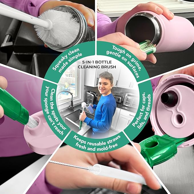 - 5 in 1 Bottle Cleaning Brush Included: One brush, endless possibilities! This versatile, detachable brush cleans every bottle part including bottles, straws, lids, and threading, ensuring every sip is fresh.