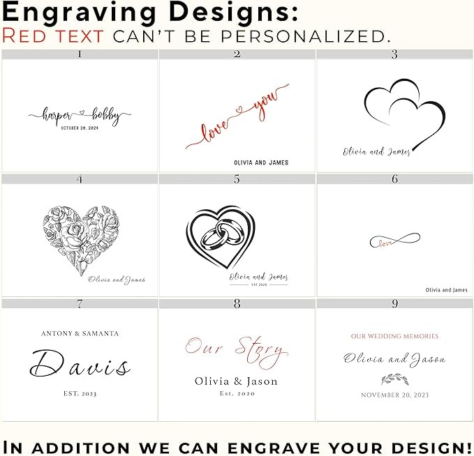 - Customizable: this acacia wood memento box can be engraved with various designs offered including the couple's names, dates or short phrase to make it unique. We’ll use the font style showcased in the photos. Additionally, it can be engraved inside(different font options), on the other lid's side, to create a surprise message for the recipient