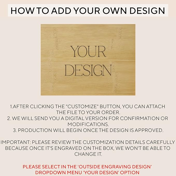 - Your Design Option: If none of our designs match your request, feel free to upload your own in PNG or JPG format. We will send you a digital version for confirmation or modifications. Production will begin once the design is approved.