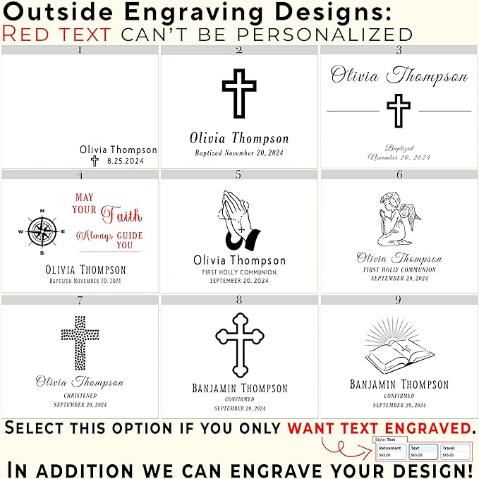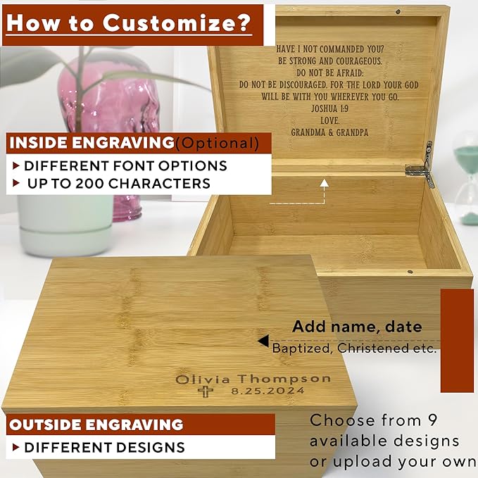 - Customizable: Personalize your keepsake box with various available designs, including a name and date. Each design can be changed to "Baptized", "Christened," "Confirmed," "First Communion," etc. or removed entirely if indicated. We’ll use the font style showcased in the photos. The inside lid can also be engraved with your text(different font options). Create a unique and meaningful gift!