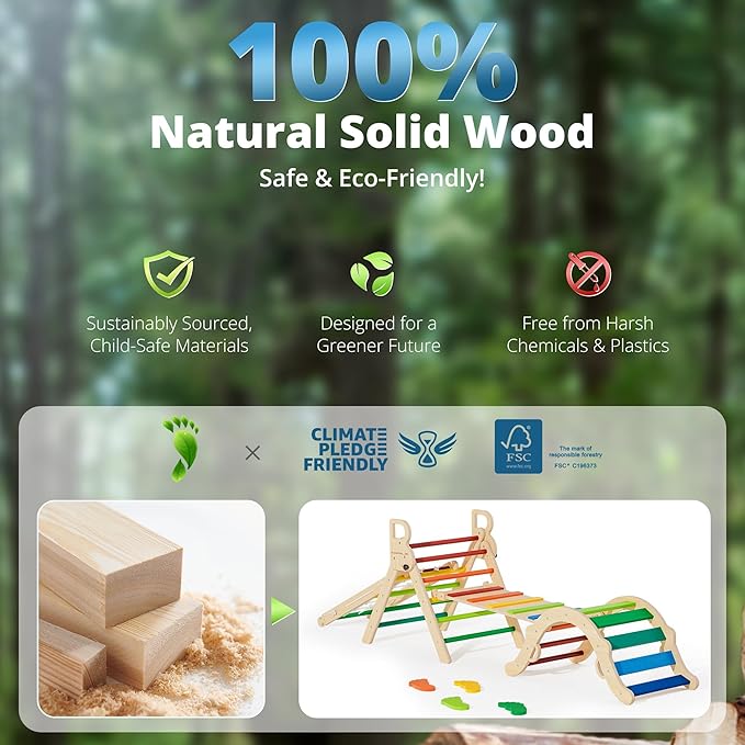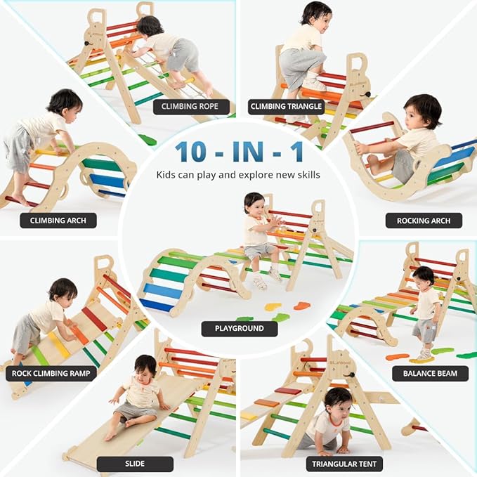 - Endless Play with Four-Piece Set: Our Pikler Set has four pieces: triangle climber, arch, ramp, and a rope ladder. It offers ten play combinations for endless fun. Designed with Montessori principles, it encourages exploration and learning