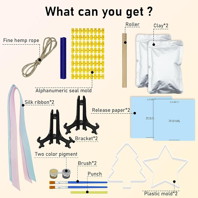 - Set Includes:Two pieces of air dried clay, roller, straw, 2 paint brushes, 2 ribbons, additional custom template kit, 2 display stands, 2 colors of paint.Grey and gold.Everything you need to make beautiful, lasting footprints or paw prints souvenir ornaments to display on your mantel or hang on your Christmas tree.