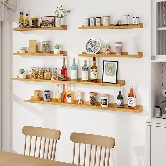 - Picture Wall Collage Decor: Do you have a lot of memorable photos, but don't know how to display them, our wood floating shelves are perfect for you! We offer 6 shelves, you can mix and match colors, height, length, and symmetry. With our long wall shelf set, your dull space will be transformed into wall art
