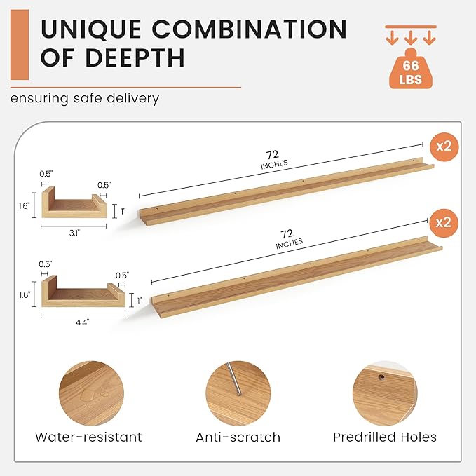 4-Pack 72 Inch Wall Mounted Floating Picture Ledge Shelves, Modern Oak Style, Perfect for Displaying Photos, Books, Collectibles, and More