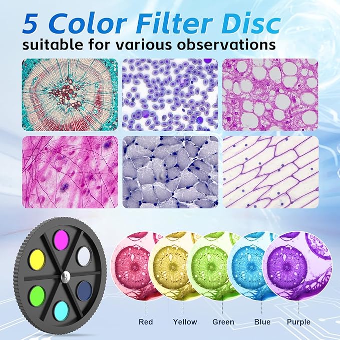- FIVE COLOR FILTER WHEELS DESIGNED FOR OBSERVATION EXPERIMENTS: Wozel Professional Optical Microscope is equipped with 6-aperture five-color filter wheels. According to your observation needs, choose different filters to eliminate infrared/ultraviolet rays, etc., more convenient for your observation. The filter wheel is easy to rotate, you can easily choose different filters to observe different specimens and experience clearer observation results.