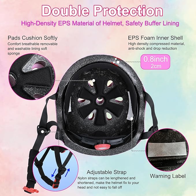 - 【Impact Resistance Girls Helmet】 Sport child youth helmet for kids is made of impact-resistant ABS shell and high-density EPS foam, sturdy and double protection. The internal soft padding can absorb sweat and reduce impact, it also can be removable, so you can clean it by yourself. The toddler bike helmet has 11 ventilation vents which keep kids cool and comfortable during multi-sports.