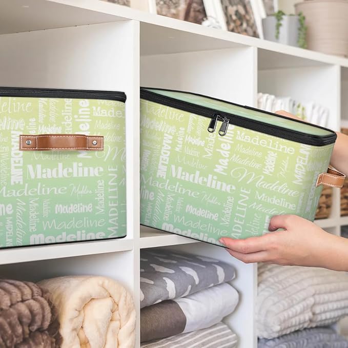 Custom Storage Basket with Name, Personalized Storage Bins with Zipper Lid, Foldable Fabric Storage Box Large capacity with Handle Yellow Green