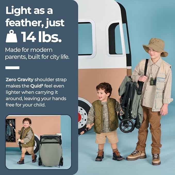 - COMPACT DESIGN & 1-HAND FOLD: The Quid³ stroller weighs only 14 lbs and has an effortless 1-hand folding system for your convenience. The kickstand feature allows the Quid³ stroller to stand on its own when folded, keeping your baby and stroller clean.