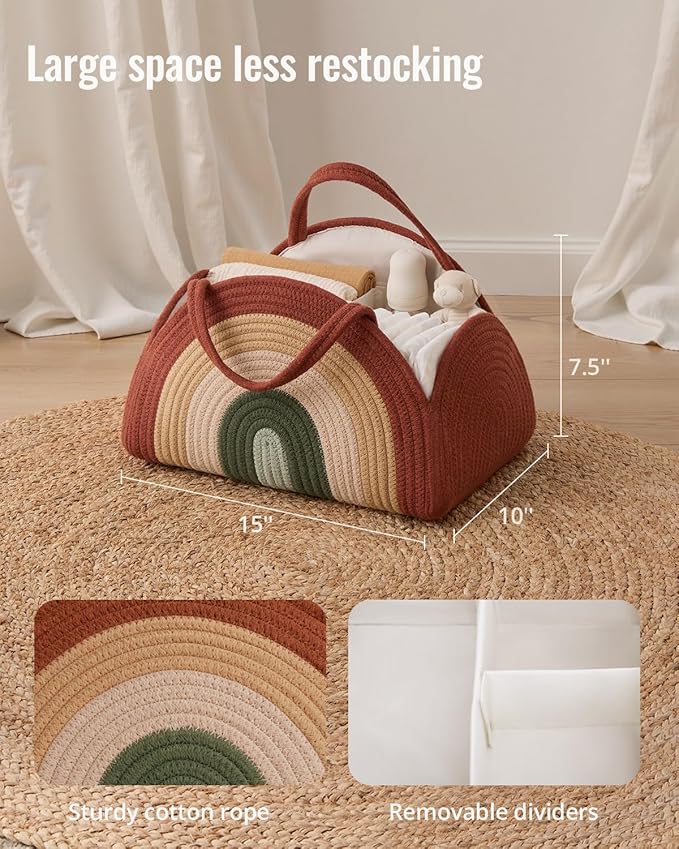 - Warm up your daily routine with thoughtful design:Inspired by boho rustic rainbows, this charming diaper caddy adds soft, natural beauty to your nursery. A newborn registry essential that brings calm, order, and heartwarming joy to every parenting moment.