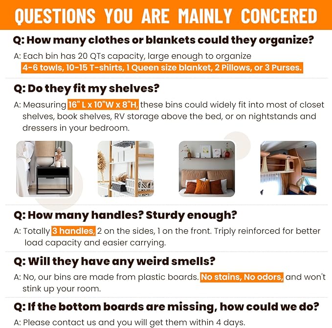 - γπ― ππππππ ππΌππΏπππ & πππΌππππ πΏπππΌπππγThese closet organizer bins feature 3 built-in handles, reinforced for better carrying and moving, especially for wall-mounted closet shelves. Made of stiff plastic boards and durable non-woven fabric, these bins for organization could remain structured for years, also odorless for safer use.