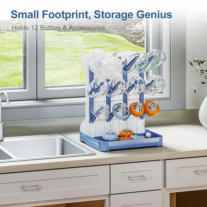 GoMaihe Baby Bottle Drying Rack: Space Saving Vertical Bottle Dryer Holder - Baby Accessories Storage Stand Organize Brushes Pacifiers on Countertop - BPA-Free - Blue