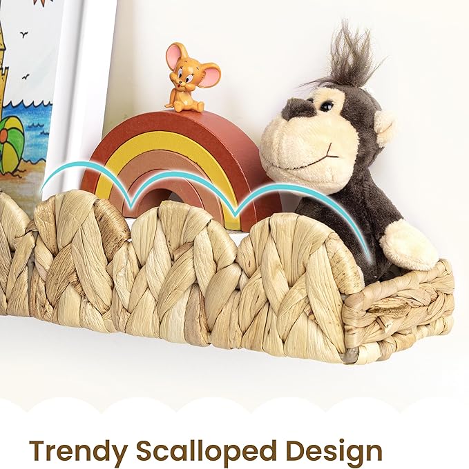 AELS Scalloped Nursery Bookshelf, Set of 2, Picture Ledge Shelf for Wall Decor, Woven Natural Water Hyacinth Floating Shelves for Books, Toys, Photo Frames, Nursery, Boho Modern Farmhouse Book Shelf