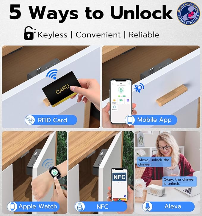 - 🔒【5 Ways to Unlock】: The smart cabinet lock can be unlocked through the Mobile App, Apple Watch, RFID Card, NFC, and Alexa. It makes unlocking more convenient and fast, without worrying about forgetting the passcode or losing keys.