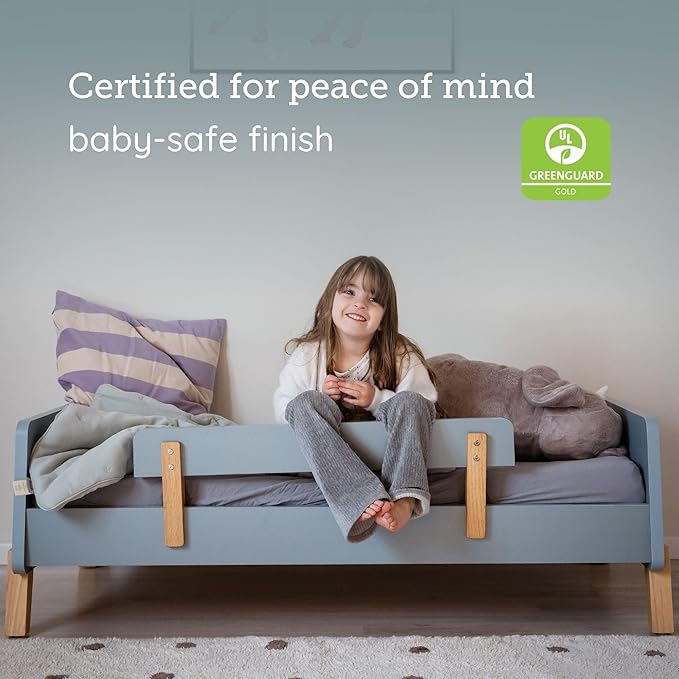 - SAFETY-FIRST DESIGN & DURABLE CONSTRUCTION – Built for growing kids with a sturdy solid wood frame, real wood legs, and a slatted base that supports up to 110 lbs. Designed as a blue toddler bed with two guard rails positioned centrally for safer sleep. The toddler bed is close to the ground, ideal for toddlers who are active sleepers, offering easy, safe access and independence.