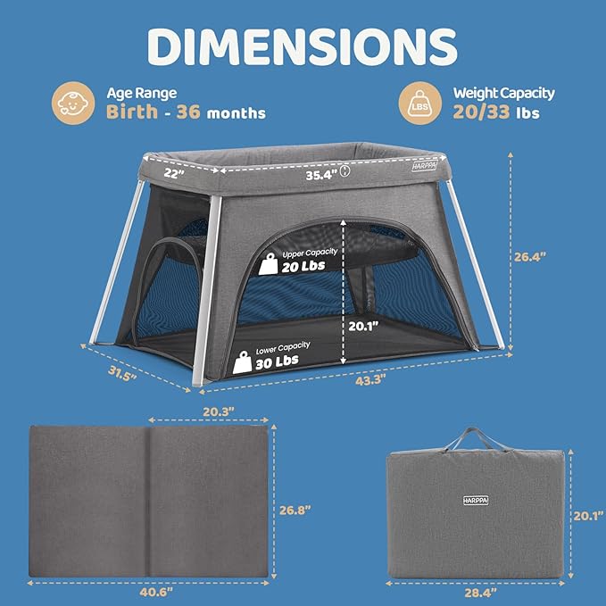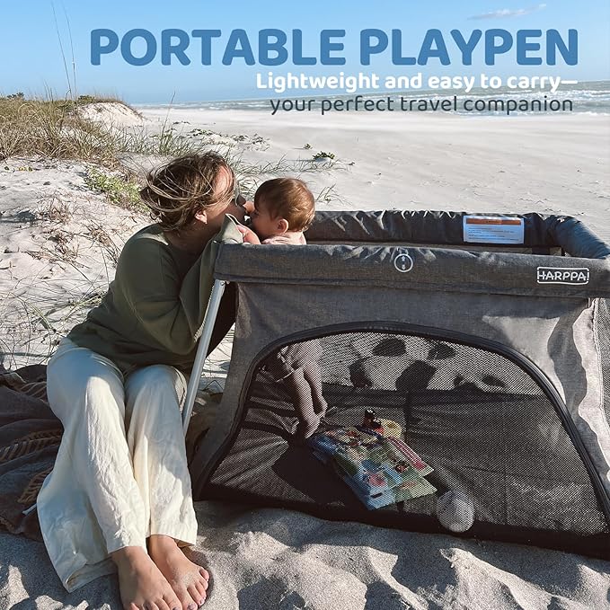 HARPPA Travel Crib with Comfy Mattress, Lightweight Portable Crib Requires No Assembly, Foldable Pack and Play for Baby and Toddlers, Compact Play Yard with Bed,Gray