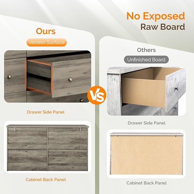 - 【Dual-Size Drawers】The 6 drawer dresser boasts ample storage space, cleverly divided into upper 2 medium drawers and 4 large drawers. This thoughtful arrangement allows you to efficiently organize and separate your belongings, ensuring each item is easy to locate and avoid unnecessary clutter.